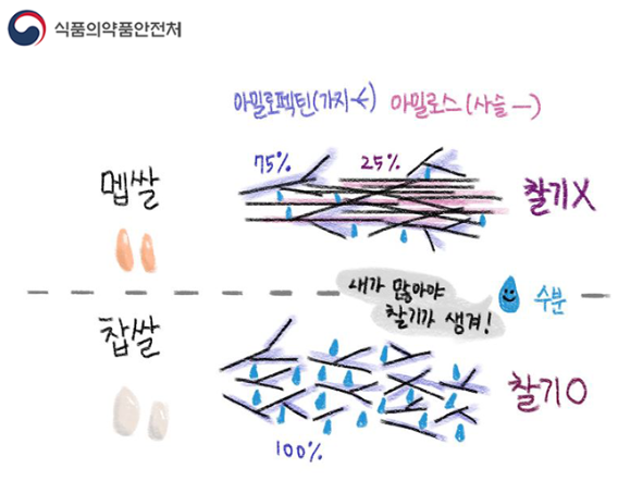 찰기는 나뭇가지 모양 사이사이에 수분이 들어가 서로 얽히며 생기는데, 사슬 모양의 아밀로스가 섞인 멥쌀의 경우는 수분이 잘 갇히지 않고 빠져나가기 때문에 찰기가 없는 것이라고 합니다.
