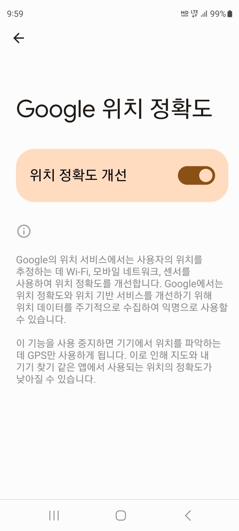 4. Google 위치 정확도 설정 화면에서 위치 정확도 개선을 활성화시킵니다.