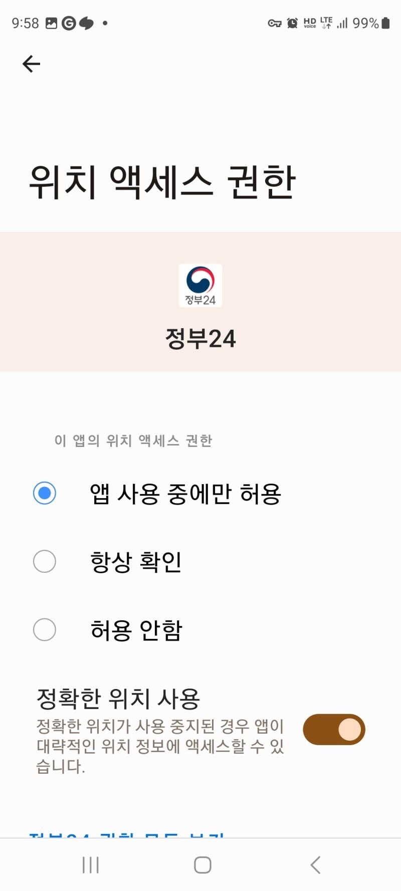 안드로이드 10버전을 실행하는 스마트폰은 앱에 위치 데이터를 제공하기 위해 GPS 권한을 설정해야 합니다. 만약 정부24 앱 이용 시 권한 설정을 허용하지 않으신 경우, 정상적으로 사용하기 위한 GPS 설정을 하려면 아래를 확인해 줍니다.