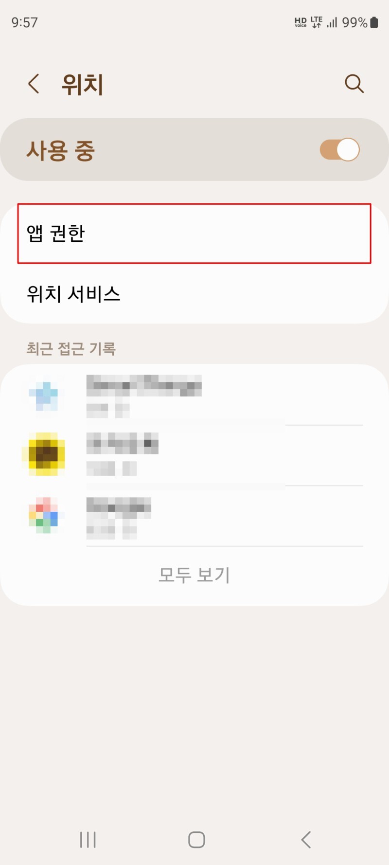 2. 위치 메뉴 설정에서 앱 권한을 클릭합니다.