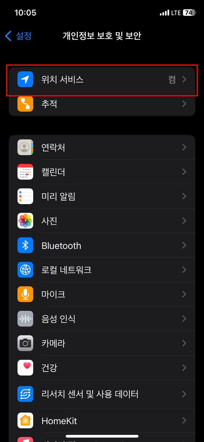 2. 개인정보 보호 및 보안 메뉴 설정에서 위치 서비스를 클릭합니다.