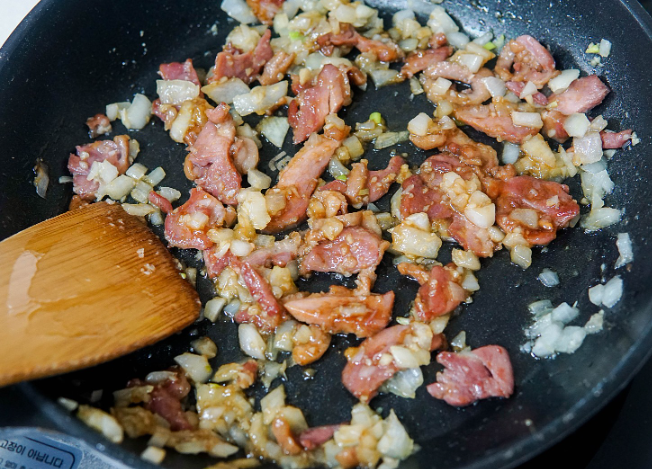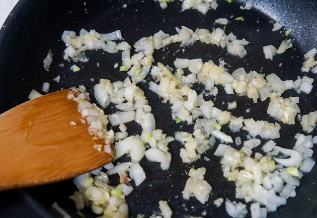 2. ①의 팬에 그대로 다진 양파와 마늘을 중불에서 볶아줍니다.