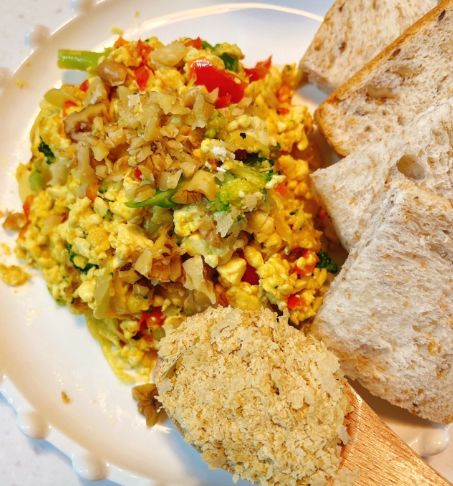 영양효모 10g(밥숟가락 가득 3스푼 정도), 두부 300g(1모), 양파 1/2, 브로콜리 조금, 파프리카 1/2, 두유 4스푼, 호두 조금, 강황가루 1/2(카레가루 대체 가능), 소금, 후추 약간