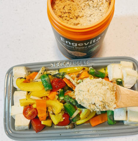영양효모 15g(밥숟가락 가득 3스푼 정도), 파프리카 1/2, 버섯, 당근, 아스파라거스, 방울토마토 취향껏, 두부 150g(1/2모), 견과류, 소금, 후추