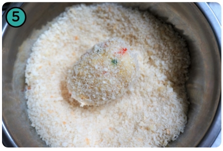 5. 소금을약간 넣고 곱게 푼 달걀물→빵가루 순으로 튀김 옷을 입혀줍니다.