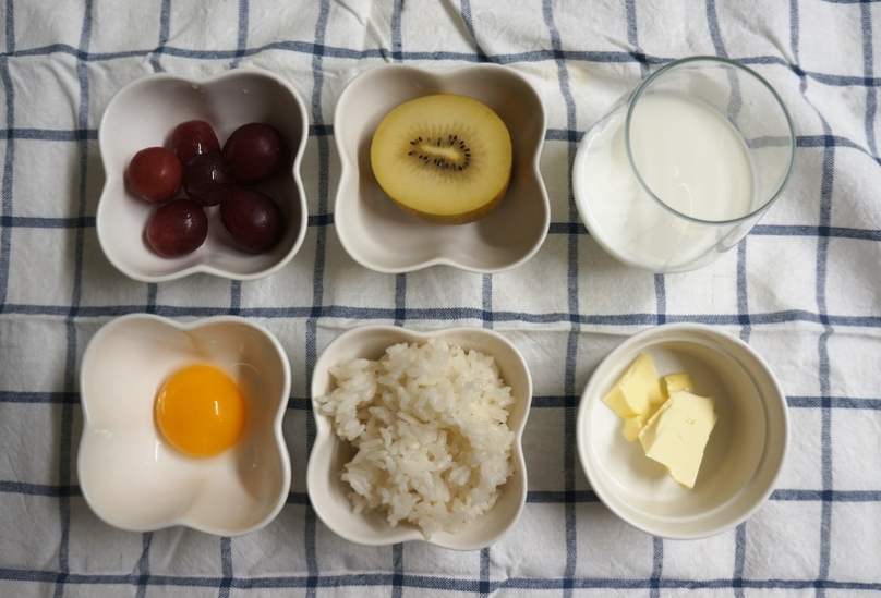 밥 100g, 우유 200ml, 설탕 2큰술, 버터 10g, 달걀노른자 1개, 키위 1/2개, 포도 8알