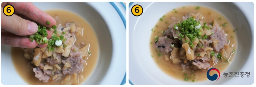 6. 그릇에 담아 미리 송송 썰어놓은 쪽파를 죽 위에 뿌려줍니다.