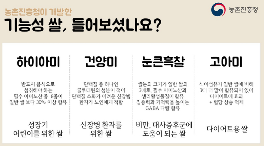 그리고 농촌진흥청에서는 무기질 함량이 높은 고아미, 컬러살 등 특이 질환 맞춤형 쌀과 다양한 기능성 쌀도 지속적으로 개발하고 있다고 합니다.