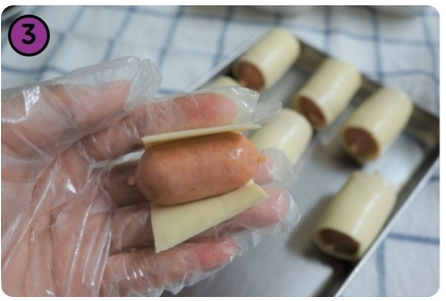 3. 비엔나소시지를 슬라이스 치즈로 감싸줍니다.