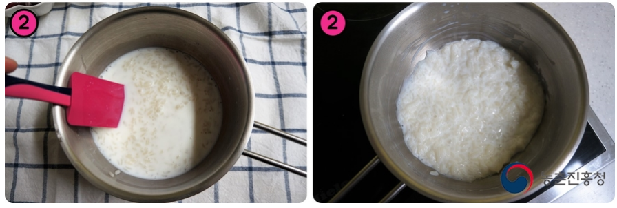 1. 차갑게 식힌 밥을 냄비에 넣고, 우유, 설탕을 넣고 덩어리 없이 저어 솎어줍니다.