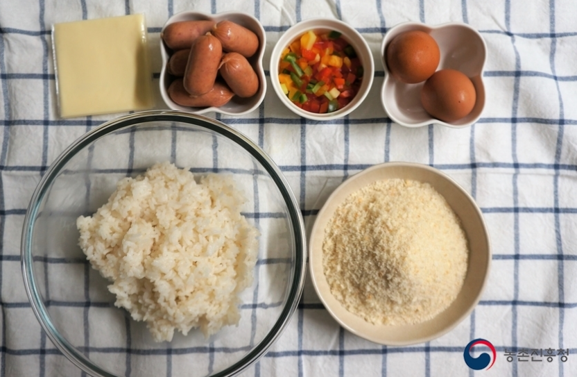 다진채소 1컵, 밥 500g, 달걀 2개 빵가루 1컵, 비엔나소시지 8개, 슬라이스 치즈 4장, 양념(소금 약간, 진간장, 케첩, 머스터드소스