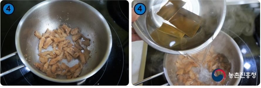 4. 냄비에 참기름 1큰술을 두르고 황태를 넣어 달달 볶은 뒤 다시마 물을 부어 끓여줍니다.