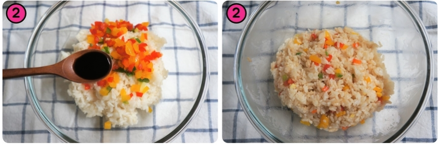 2. 따뜻한 밥에 다져놓은 파프리카를 넣고 소금, 진간장, 참기름에 버무려 놓습니다.