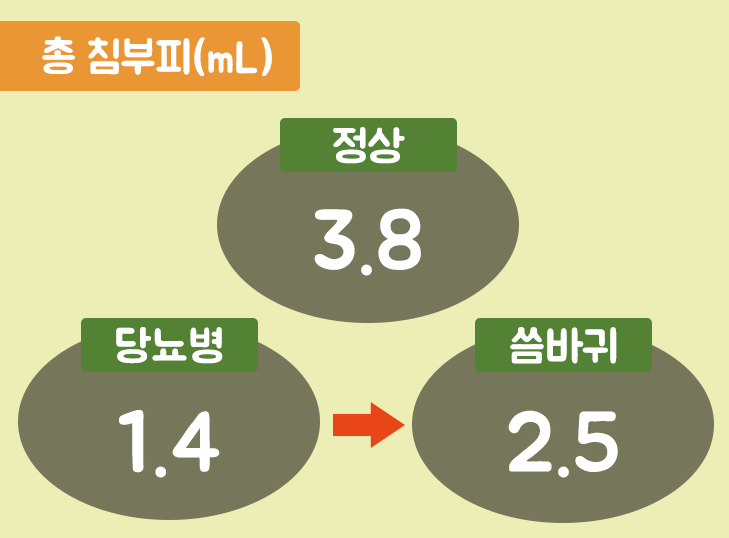 보통 당뇨병에 걸리지 않은 사람들이 30분 동안 만들어 내는 침의 부피는 약 3.8㎖라고 합니다. 당뇨병에 걸린 사람들이 만들어 내는 침의 부피는 1.4㎖로 보통 사람들에 비해 3배 가까이 침을 만들어 내지 못한다고 합니다.
