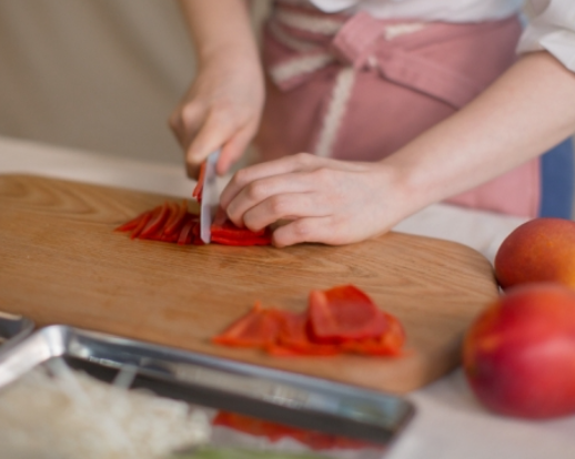 4. 홍파프리카는 씨를 제거하고 얇은 시틱 형태로 썰고, 백오이는 돌려 깎기, 팽이버섯은 밑동 제거 후 2~3개씩 떼어놓습니다.