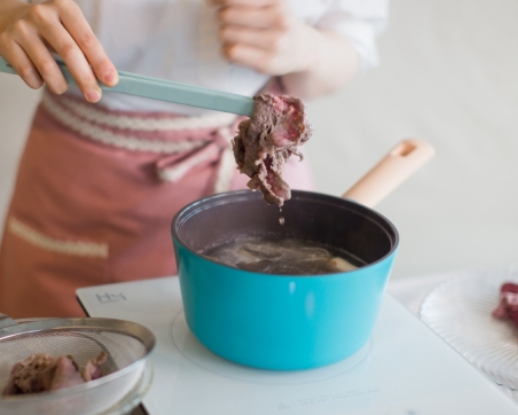2. 찬물에 파뿌리, 알마늘, 월계수잎, 통후추를 넣고 물이 끓으면 소고기를 데친 후 건져 식혀줍니다.