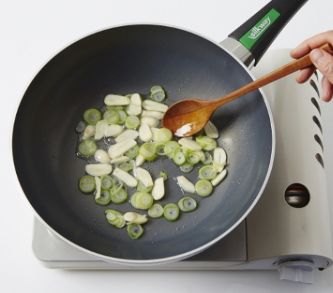 2. 중약 불로 달군 팬에 식용유 2T를 두른 뒤 마늘과 대파를 넣고 향이 올라올 때까지 볶아줍니다.