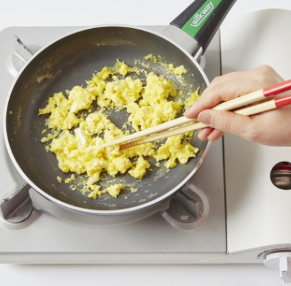 5. 다른 팬을 중간 불로 달궈 식용유 1T를 두른 뒤 달걀을 스크램블로 익힙니다.