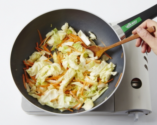 3. 센 불로 올려 당근, 양배추를 넣고 소금, 후춧가루를 뿌려가며 30초간 볶아줍니다.