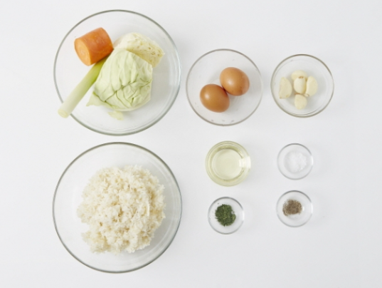 양배추 1/6통, 마늘 5쪽, 대파 10cm, 식용유 3T, 달걀 2개, 미지근한 밥 2공기, 당근 1/6개, 소금 약간, 후춧가루 약간, 파슬리가루 약간