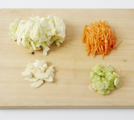 1. 양배추는 굵게 채 썰고, 당근은 곱게 채 썰고, 마늘은 납작 썰고, 대파는 송송 썰어줍니다.