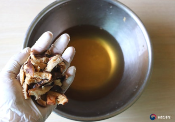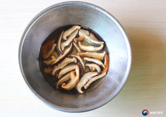1. 건표고버섯 20g은 미지근한 물 2컵에 담가 10분 정도 불려둔 뒤 물기를 꽉 짜줍니다.