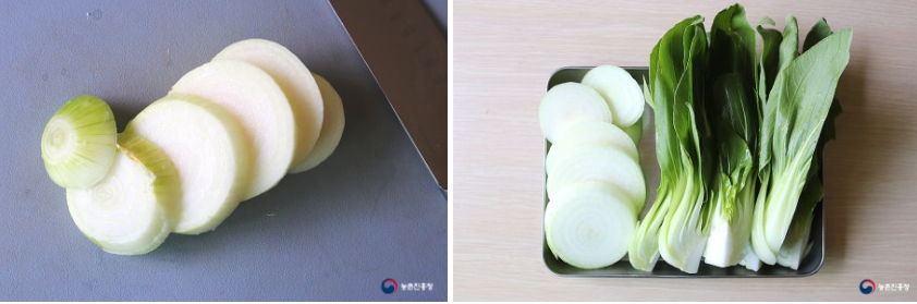 1. 양파 1개는 1cm 두께로 동그란 모양을 살려 도톰하게 썰어주고, 청경채 2포기는 길이로 1/2 혹은 1/등분 해줍니다.
