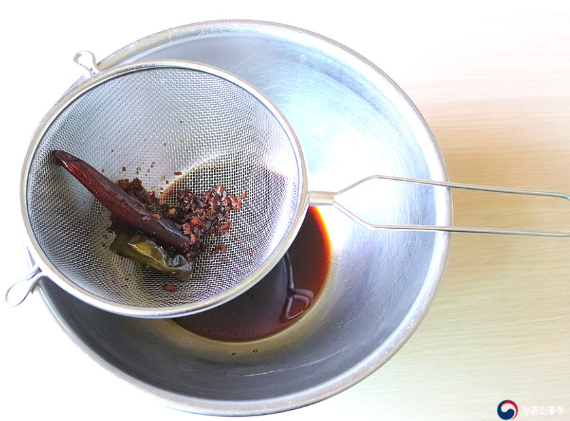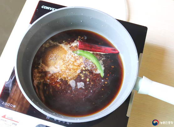 3. 팬에 양념장 재료 건고추 1개, 청양고추 1개, 흑설탕 2큰술, 양조간장 4큰술, 맛술 2큰술, 다진 마늘 1큰술, 물 1/2컵(100ml)를 넣고 중약불에서 15분간 끓인 후 체에 걸러줍니다.