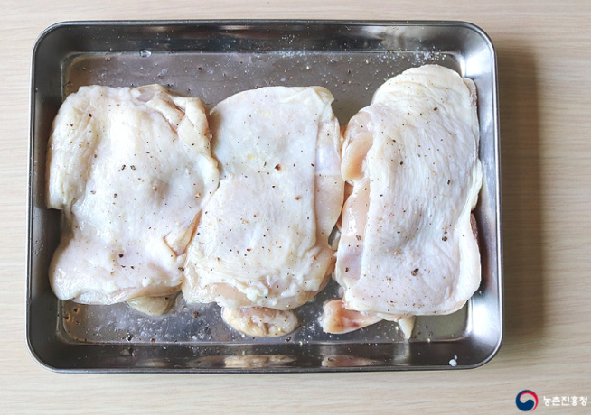 2. 닭 정육살 3개는 씻은 후 껍질 쪽에 칼집을 넣고 소금 약간, 후춧가루 약간, 맛술 1큰술을 뿌려 밑간해 줍니다.