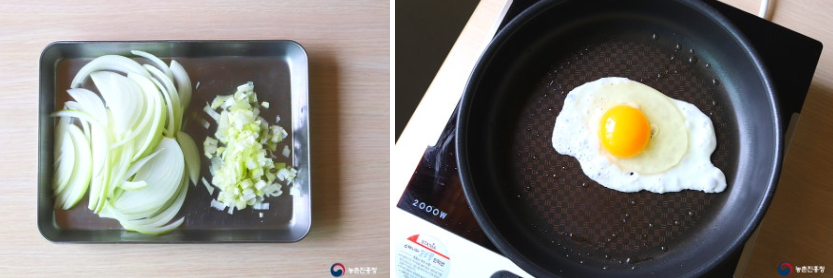2. 양파 1/2개는 얇게 슬라이스하고 대파 10cm(1개)는 잘게 다져줍니다. 달걀 1개는 식용유 살짝 두른 팬에 프라이해 건져줍니다.