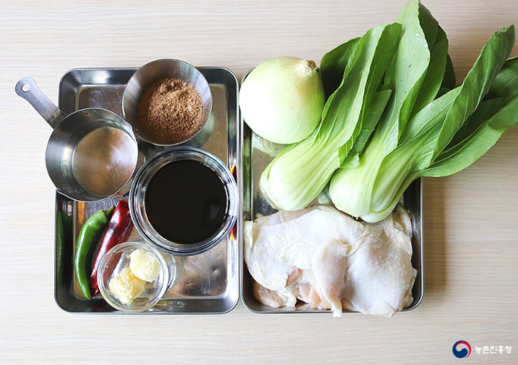 닭정육살 3개, 양파 1개, 청경채 2포기, 식용유 2큰술, 맛술 1큰술, 소금약간, 후춧가루 약간, 양념장 재료(건고추 1개, 청양고추 1개, 흑설탕 2큰술, 양조간장 4큰술, 맛술 2큰술, 다진 마늘 1큰술, 물 1/2컵)