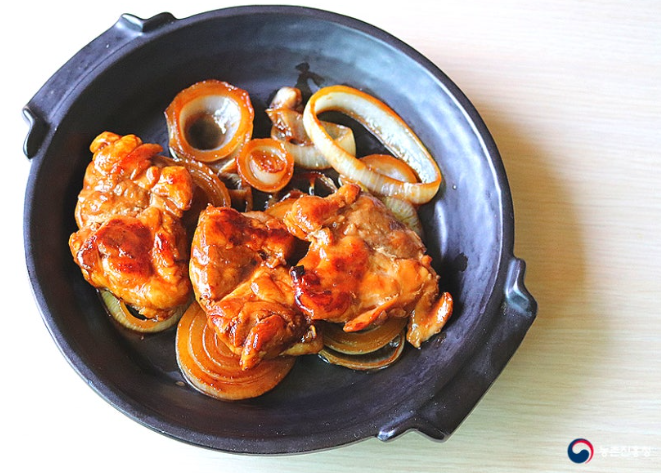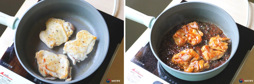 4. 팬에 식욕유 1큰술을 두르고 닭고기를 얹어 앞뒤로 노릇하게 구워낸 뒤, 양념장을 부어 중불에서 조리힙니다.