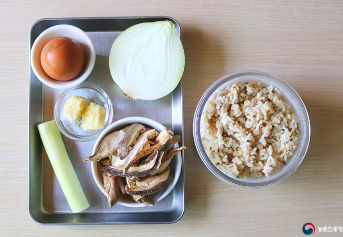 밥 1공기, 건표고슬라이스 20g, 양파 1/2개, 대파 10cm(1개) 달걀 1개, 다진 마늘 1큰술, 통깨 약간, 식용유 2큰술, 설탕 1/2큰술, 양조간장 2큰술, 참기름 1큰술, 표고버섯 불린 물 5큰술, 후춧가루 약간