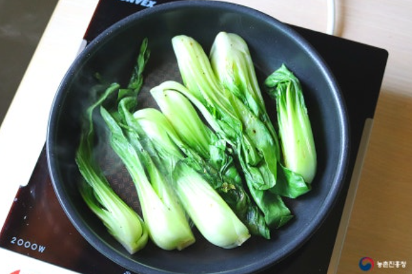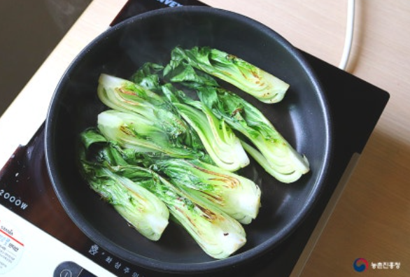 6. 새 팬에 식용유 1큰술을 두른 뒤 청경채를 넣고 소금 약간, 후춧가루 약간을 뿌려가며 살짝 볶아줍니다.