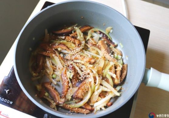 5. 버섯이 부드러워지면 센 불로 올려 양파를 넣고 재빨리 볶다가 투명해지기 시작하면 간장 1큰술, 후춧가루 약간, 참기름 1큰술을 넣고 간을 해줍니다.