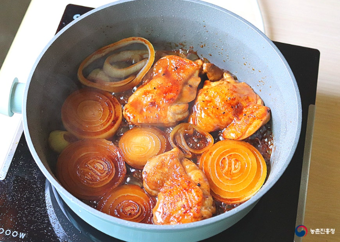 5. 닭고기에 간이 배면 양파를 넣고 10분 정도 더 조려줍니다.