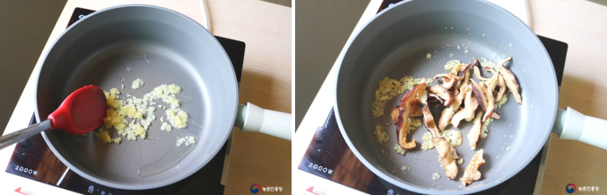 3. 중약 불로 달군 팬에 식용유 2큰술을 둘러 마늘 1큰술을 넣고 기름을 낸 뒤 불린 표고버섯을 부드럽게 볶아줍니다.