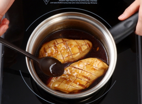 4. ②의 소스가 끓기 시작하면 ③의 닭가슴살을 조립니다.