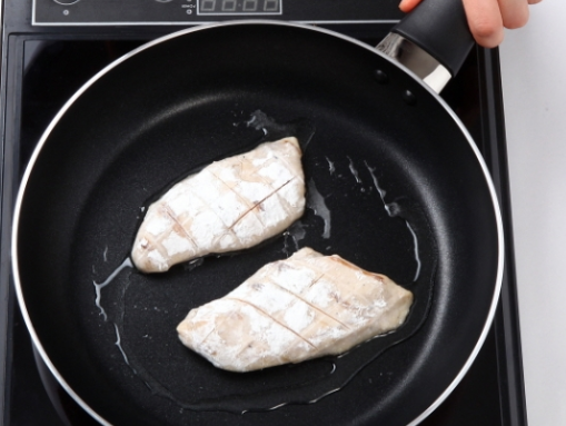 3. ①의 닭가슴살에 전분을 묻혀 기름 두른 팬에 구워냅니다.