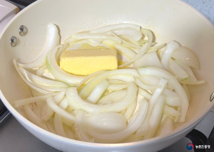 1. 프라이팬에 채 썬 양파(반개)와 버터(한 조각/약 30g)를 넣고 양파가 투명해질 때까지 중불에서 볶아줍니다.