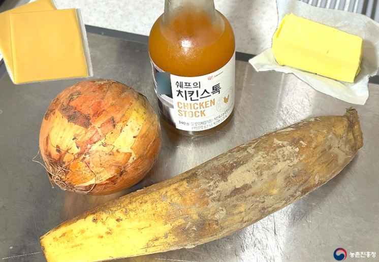 연근 1개(약 400g), 양파 반 개, 체다치즈 슬라이스 2장, 버터 한 조각(약 30g), 액상 치킨스톡 1스푼, 소금, 후추