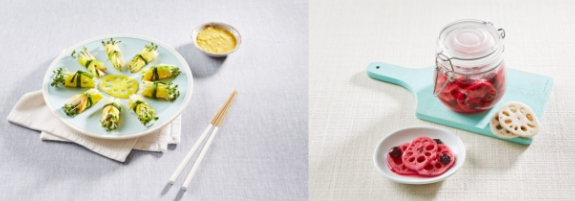연근은 주로 반찬용으로 조려서 먹지만, 아삭한 식감과 은은한 단맛, 그리고 특이한 문양을 잘 살린다면 다양한 변신이 가능합니다. 신선한 '샐러드'의 아삭한 토핑 재료로 제격이며, 블루베리와 함께 상큼한 '연근 피클'을 만들 수 있습니다. 또 연근 위에 오이, 맛살 등을 얹어 부추로 묶은 '연근쌈', 다진 연근에 찹쌀가루, 돼지고기를 넣고 쪄먹는 쫄깃한 '연근 찹쌀찜'도 가능합니다.