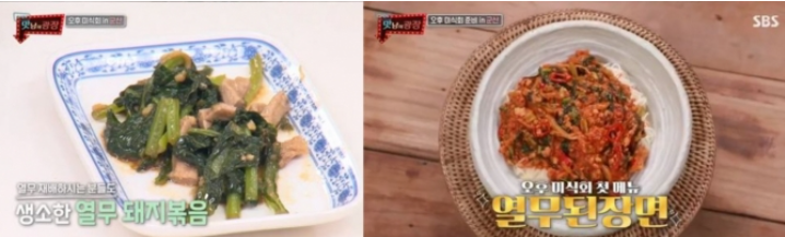 요리연구가 백종원이 선보인 열무 요리도 인기 레시피입니다. 백종원은 열무 소비의 확산을 위해 한 예능프로그램(2020년)에서 '열무 된장면'과 '열무 돼지고기 볶음'을 소개한 바 있습니다. 열무 된장면은 우선 파기름에 양파, 마늘을 볶아줍니다. 설탕, 간장, 된장, 고추장, 홍고추와 함께 열무를 넣고 볶아줍니다. 이 열무 양념장을 삶은 면 위에 올려주면 '열무 된장면'이 완성입니다.