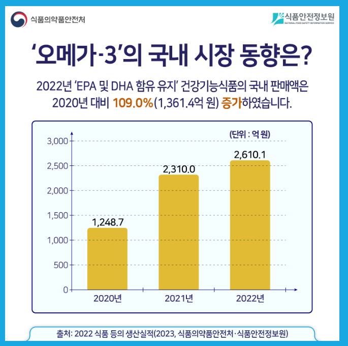 오메가-3의 국내 시장 동향은 2022년 'EPA 및 DHA 함유 유지' 건강기능식품의 국내 판매액은 2020년 대비 109.0%(1,361.4억 원) 증가했다고 합니다.