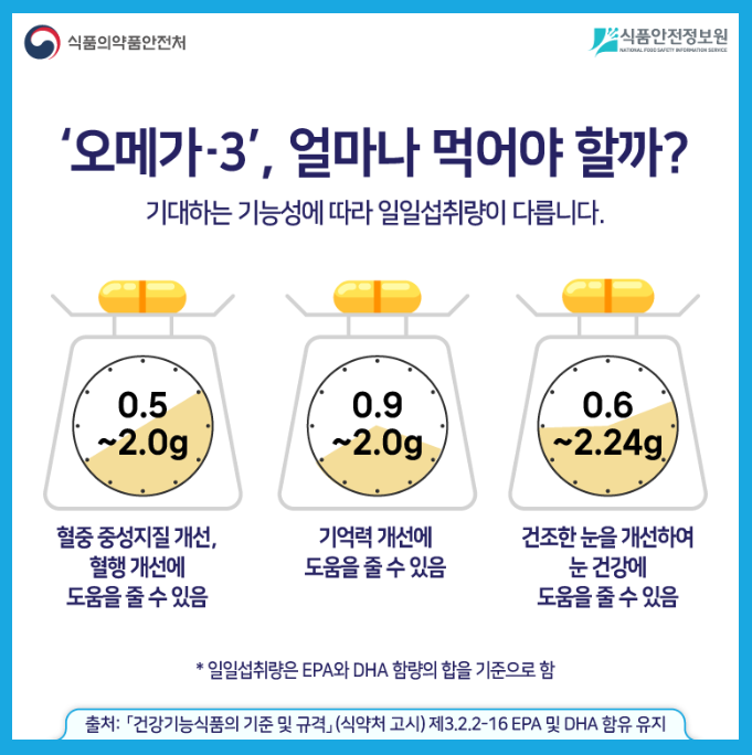 ※ EPA(eicosapentaenoic acid), DHA(docosahexaenoicacid)는 오메가-3 불포화지방산의 한 종류 출처 : 「건강기능식품의 기준 및 규격」 (식약처 고시) 제3.2.2~16 EPA 및 DHA 함유 유지