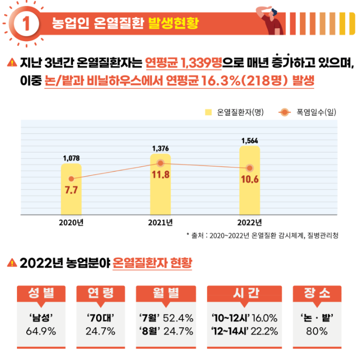 ※ 농림어업인 혹은 발생 장소가 논밭·비닐하우스인 경우(질병관리청 온열질환 응급실 감시체계)