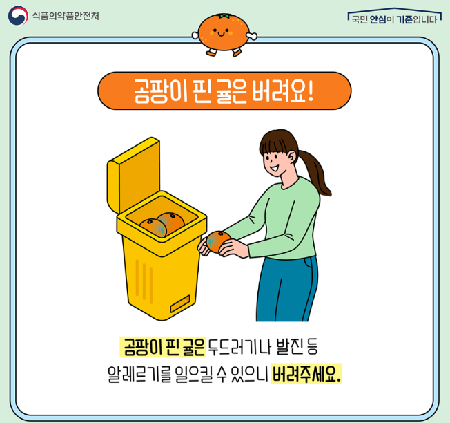 곰팡이가 핀 귤은 두드러기나 발진 등의 알레르기를 일으킬 수 있으니 버려야 합니다.