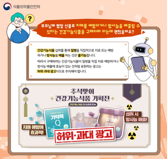 따라서 구매하려는 건강기능식품이 질병을 직접 치료·예방하거나 방사능 배출에 효능이 있는 것처럼 표현하는 광고는 허위 ·과대광고이므로 주의해야 합니다.