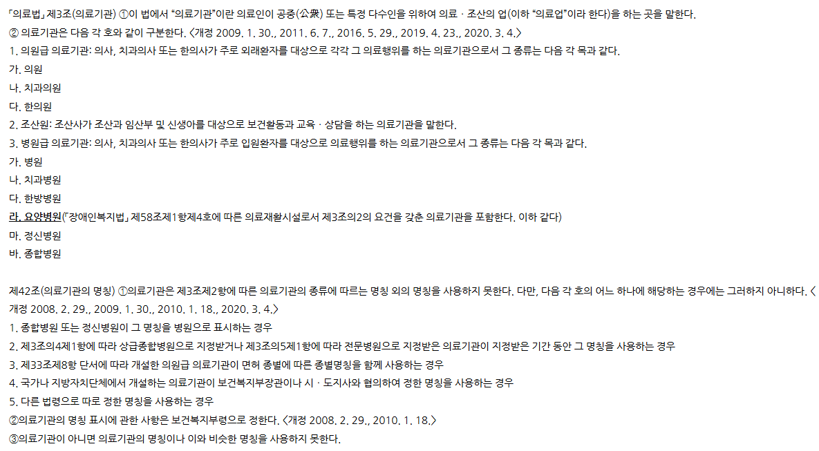 요양병원은 이름에서 알 수 있는 것과 같이 '병원', 즉 의료기관입니다. 용양병원은 아래 의료법에 따라 지정 받은 의료 기관이고, 법에 의거 명칭에 "요양병원"이 들어간다고 합니다.