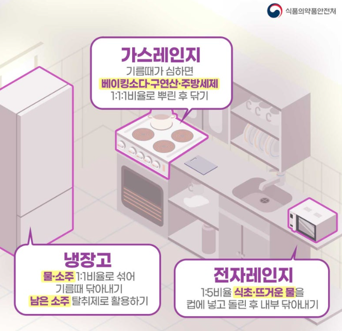 기름때가 심하면 베이킹소다, 구연산, 주방세제를 1:1:1 비율로 뿌린 후 닦아줍니다.